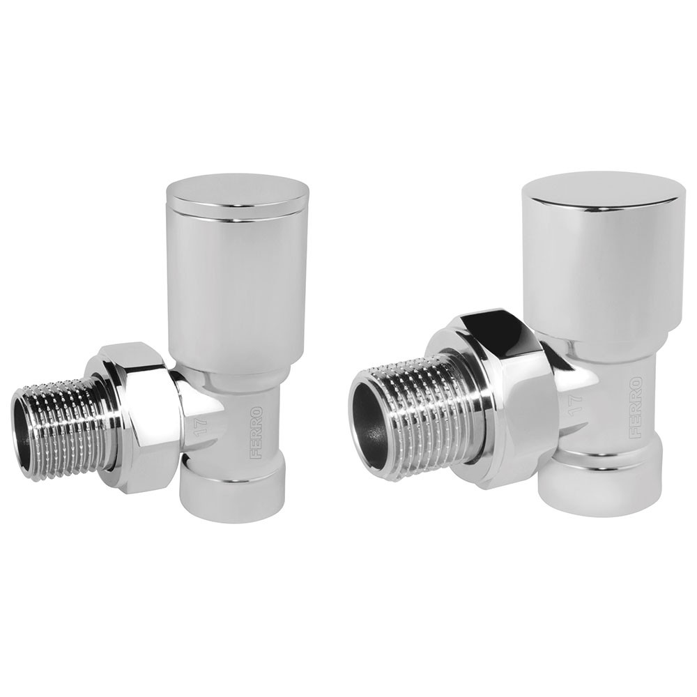 Комплект радиаторный угловой хром Ferro ZGB31CR нр1/2''-вр1/2'' для подключения систем отопления. Элементы комплекта: регулировочный клапан угловой 1/2”, отсекающий клапан угловой 1/2”.