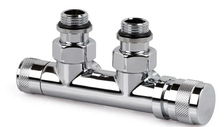 Кран термостатический угловой для стальных радиаторов 1/2"х3/4" хром ICMA. Ручное переключение из однотрубного режима работы в двухтрубный. Шаг выходов 50 мм.