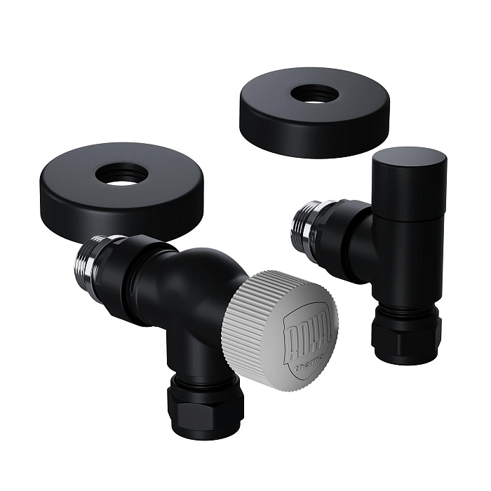 Термостатические наборы серии Design Pro поставляется в необходимой для чистового монтажа комплектации: клапан термостатический для установки на подающий трубопровод, запорный клапан для установки на обратный трубопровод, 2 гайки-фитинга для подключения клапанов к монтажной трубке 15 мм и 2 цельных латунных отражателя с внутренним резиновым уплотнением внутренним диаметром 15,2 мм.