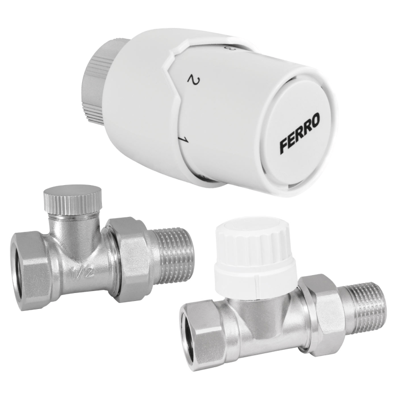 Термостатический комплект 1/2" прямой Ferro ZTM20 нр1/2''-вр1/2'' для подключения систем отопления. Элементы комплекта: термостатическая головка GT20, термостатический клапан, отсекающий клапан.