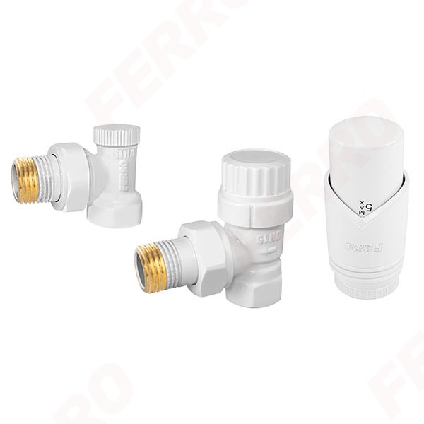 Термостатический комплект 1/2" угловой белый Ferro ZTM31WH нр1/2''-вр1/2'' для подключения систем отопления. Элементы комплекта: термостатическая головка GT30, термостатический клапан угловой 1/2”, отсекающий клапан угловой 1/2”.