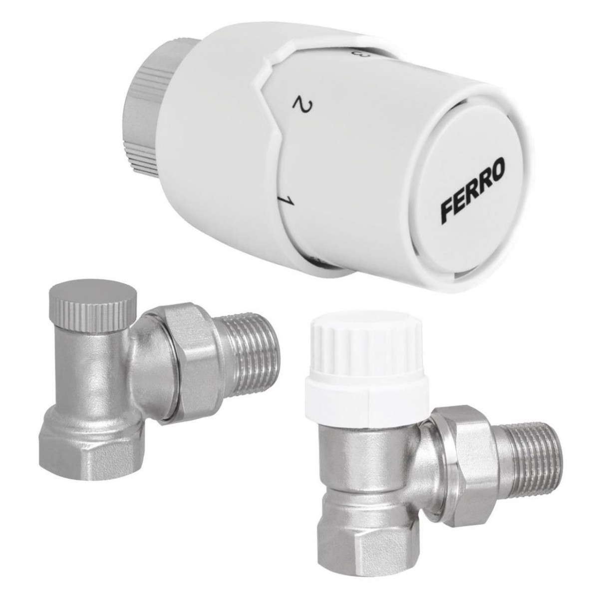 Термостатический комплект 1/2" угловой Ferro ZTM21 нр1/2''-вр1/2'' для подключения систем отопления. Элементы комплекта: термостатическая головка GT20, термостатический клапан, отсекающий клапан.