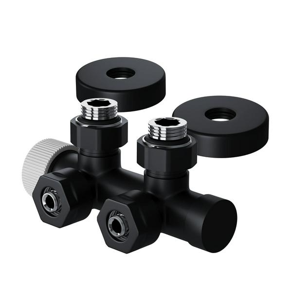 Узел нижнего подключения термостатический угловой серии Design Pro поставляется в необходимой для чистового монтажа комплектации: клапан термостатический для установки на подающий трубопровод, запорный клапан для установки на обратный трубопровод, 2 гайки-фитинга для подключения клапанов к монтажной трубке 15 мм и 2 цельных латунных отражателя с внутренним резиновым уплотнением внутренним диаметром 15,2 мм.