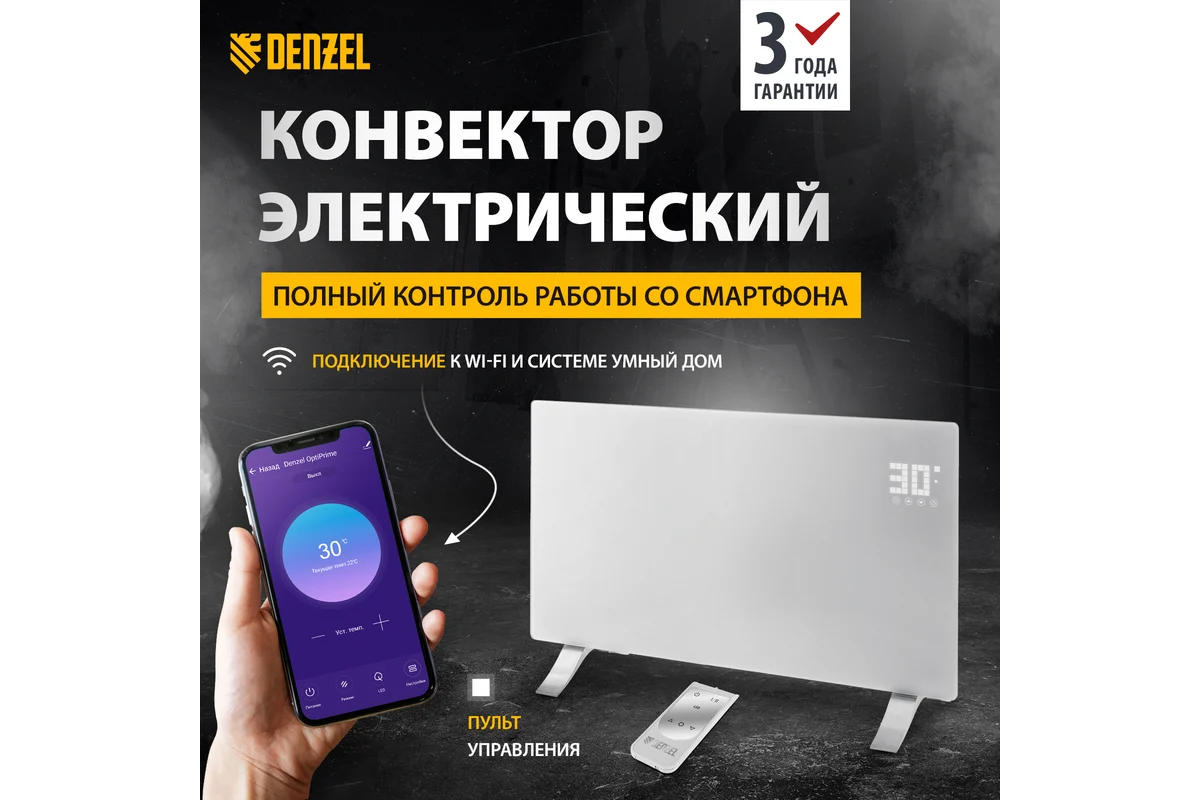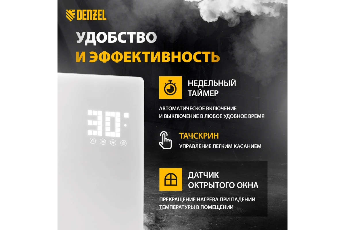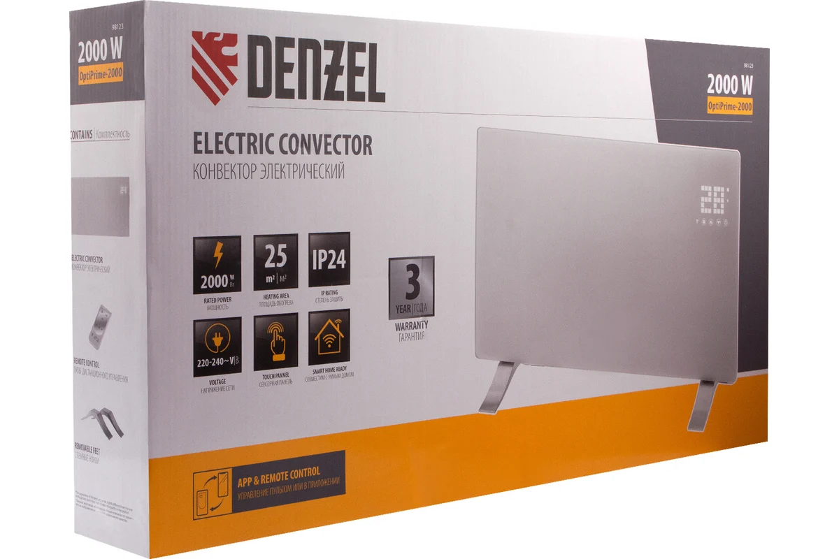 Электрический конвектор Denzel OptiPrime-2000 максимальной мощностью 2000 Вт, с тачскрином, цифровым термостатом и функцией подключения к Wi-Fi, рассчитан на обогрев квартиры, дачи, загородного дома, офиса, а также пригодится в производственных, бытовых и общественных помещениях. Рекомендуемая площадь обогрева — 25 кв.м. Две мощности обогрева 1000 и 2000 Вт позволяют поддерживать температуру в отапливаемой комнате и полностью прогревать холодные помещения.