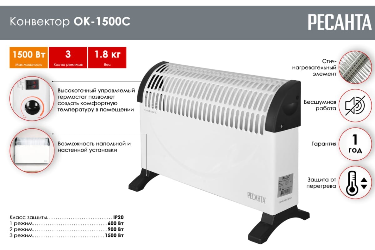 Конвектор электрический Ресанта ОК-1000С 67/4/6, мощность 1000 Вт, напольный монтаж, управление механическое, площадь обогрева 10 м2.