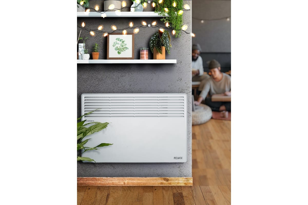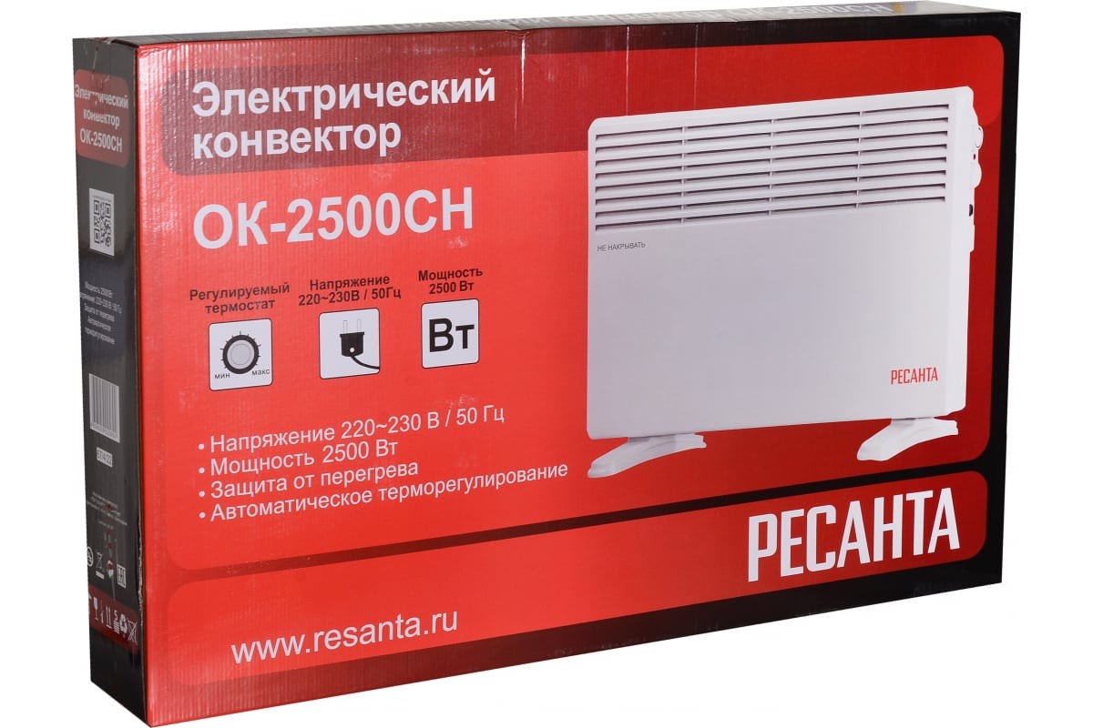 Конвектор электрический Ресанта ОК-2500СН 67/4/22, мощность 2500 Вт, настенный/напольный монтаж, управление механическое, площадь обогрева 25 м2.