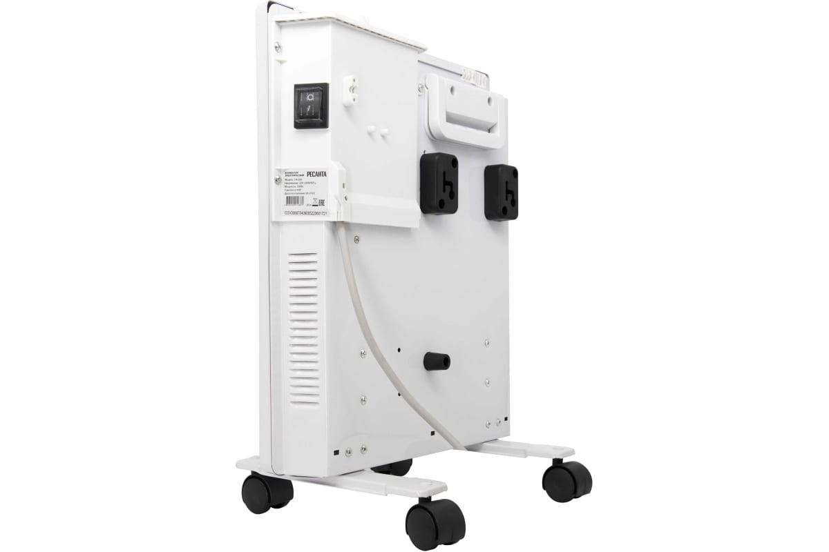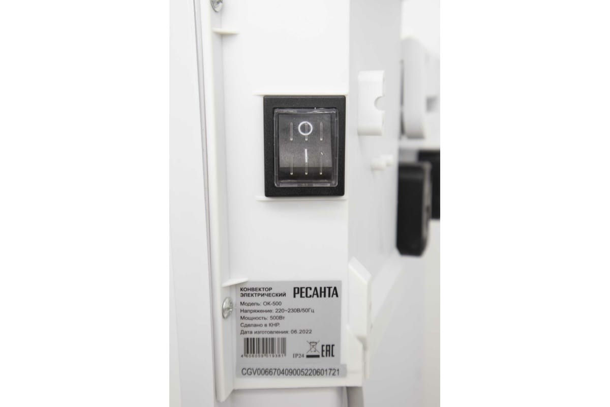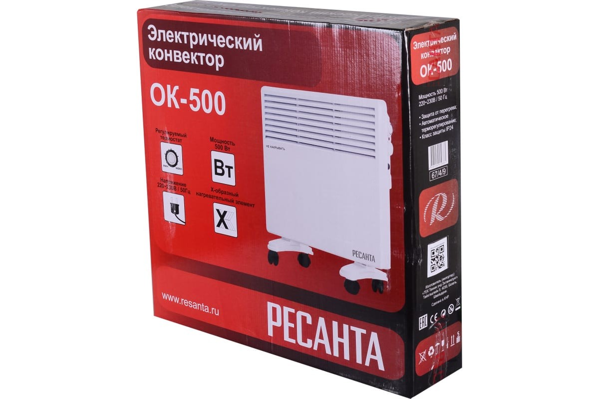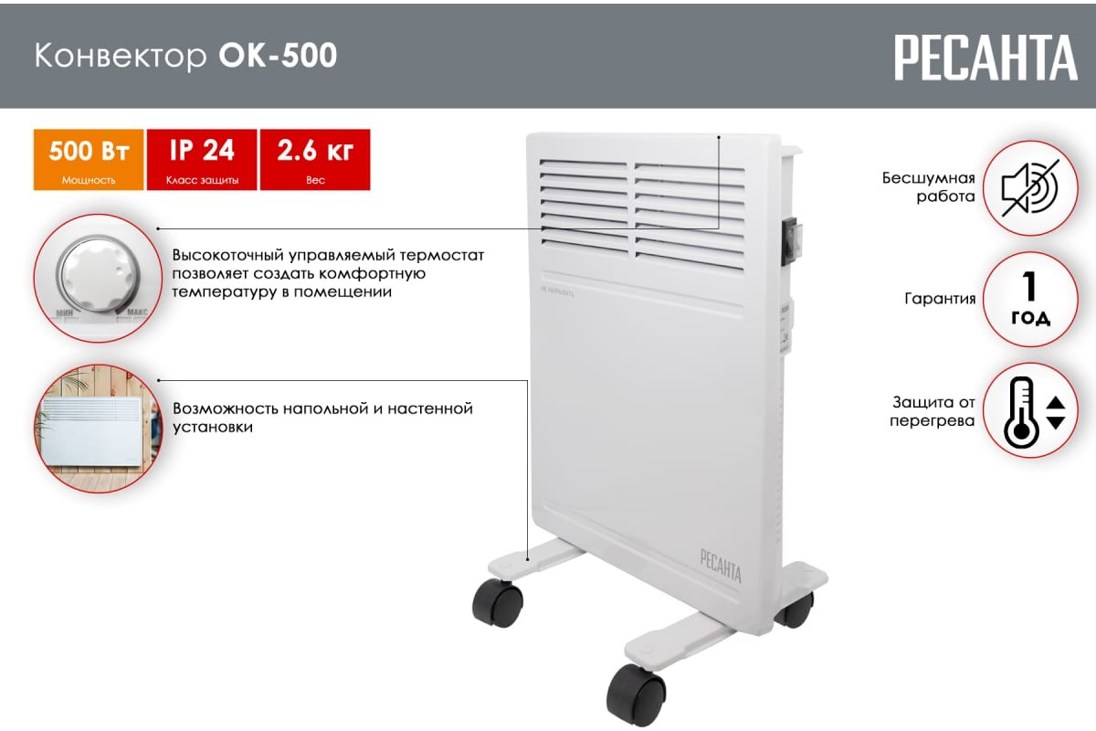 Конвектор электрический Ресанта ОК-500 67/4/9, без термостата, мощность 500 Вт, настенный/напольный монтаж, управление механическое, площадь обогрева 5 м2.