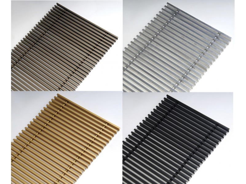 В стандартном исполнении предлагаются рулонные решетки, которые являются съемным декоративным элементом конвектора и изготавливаются из анодированного алюминия разных цветов: «серебро», «золото», «бронза». Другие расцветки можно выполнить под заказ.