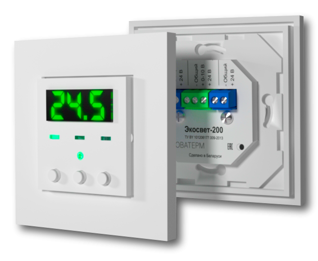 Предназначен для управления вентиляторами внутрипольных конвекторов по протоколу 0-10 В и клапаном подачи теплоносителя (24 В). Экосвет-200 поддерживает заданную температуру в помещении, теплопроизводительность напольных конвекторов.