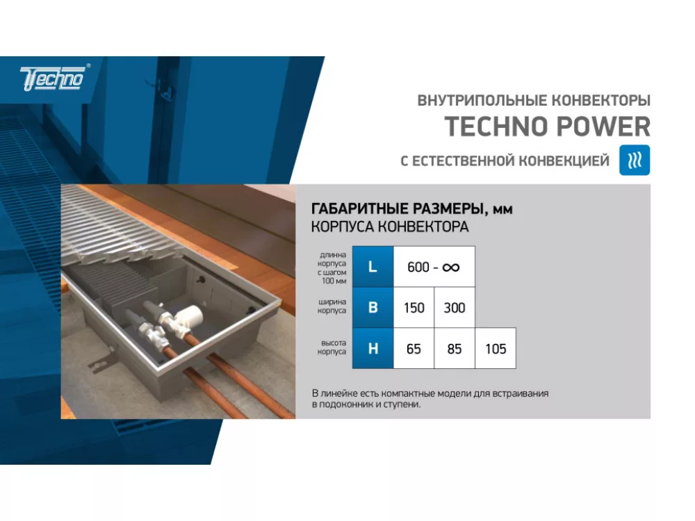 Внутрипольные конвекторы Техно - это отличная альтернатива обычной системе отопления. Они могут использоваться для отопления помещений как самостоятельно, так и в качестве дополнительного отопления в комбинации с другими устройствами. Встраиваемые конвекторы Techno полностью адаптированы для эксплуатации в российских системах центрального и автономного водяного отопления, могут быть установлены как в однотрубную, так и в двухтрубную систему. Рекомендованы для применения в системах отопления с принудительной циркуляцией.