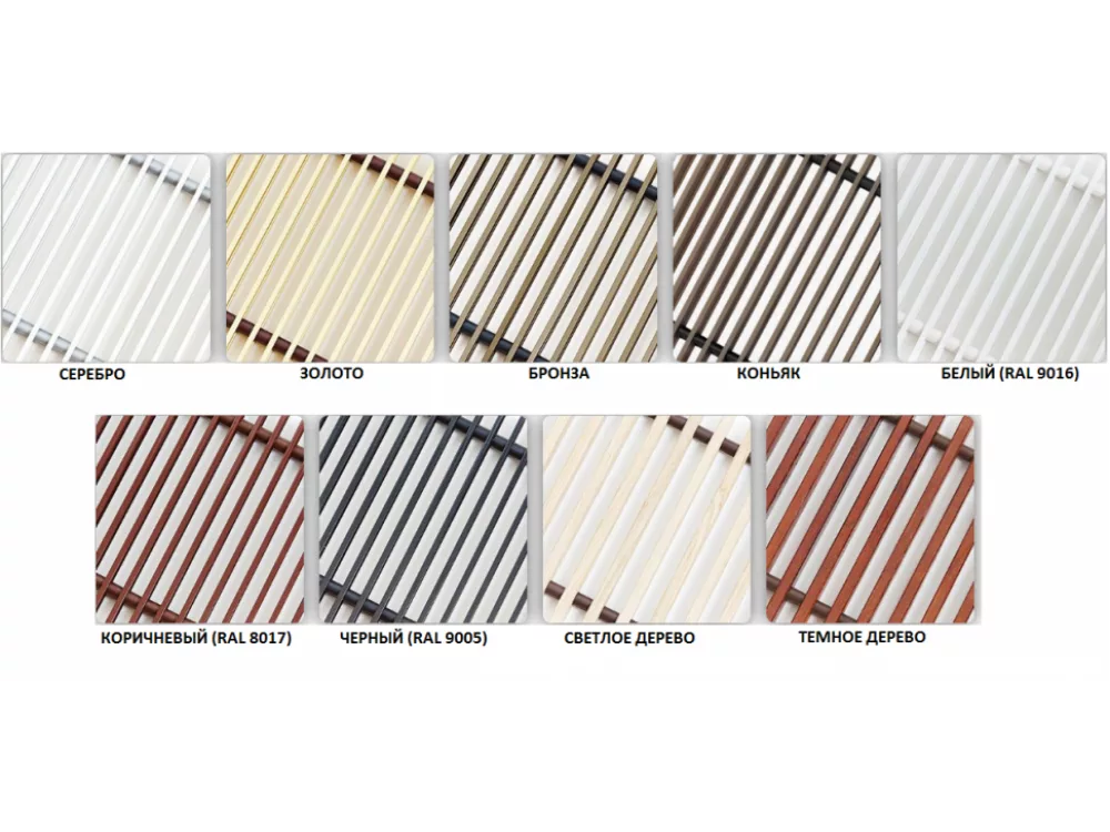 Декоративные решетки для конвекторов являются рулонными, гибкость ей придает стальная пружина внутри. Шаг решетки — 12 мм. Решетки для внутрипольных конвекторов Techno Vent KVZV/24V являются съемным декоративным элементом конвектора и изготавливаются из анодированного или крашенного алюминия разных цветов «Серебро», «Белый RAL 9016», «Коричневый RAL 8017», «Черный RAL 9005», «Золото», «Бронза», «Коньяк», «Темное дерево», «Светлое дерево». Возможна окраска любым цветом RAL под заказ. Декоративные алюминиевые решетки имеют ширину от 150 до 420 мм и используются в конвекторах Techno. В решетках Техно, можете быть уверены, служить будут долго.