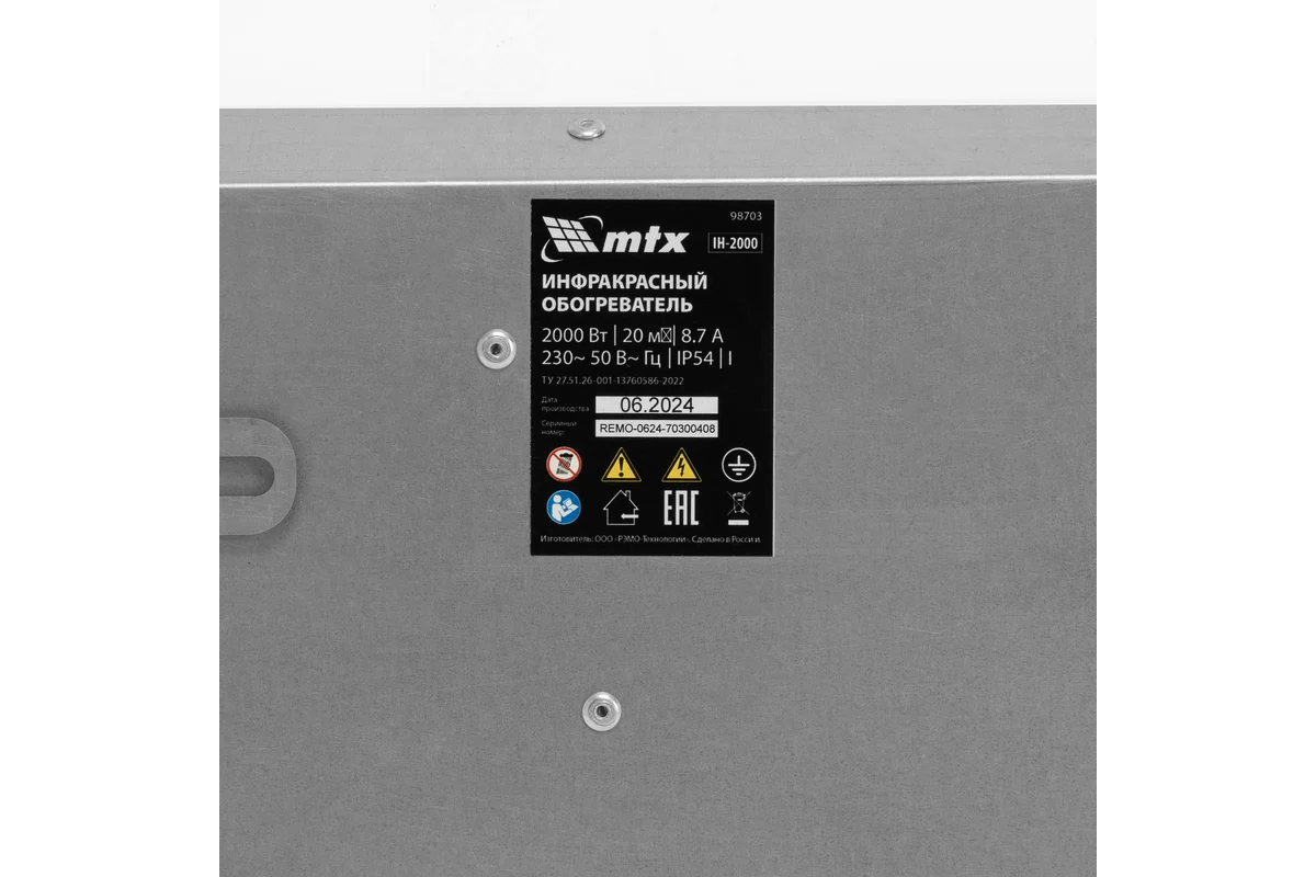 Инфракрасный обогреватель MTX IH-2000 подключается к сети 230 В, потребляет мощность до 800 Вт, защищен по стандарту IP54 и оснащен кабелем длиной 1,8 м с вилкой. Предназначен для обогрева помещений в холодное время года. Служит основным источником тепла на площади до 20 кв. м и дополнительным — в помещениях до 40 кв. м.