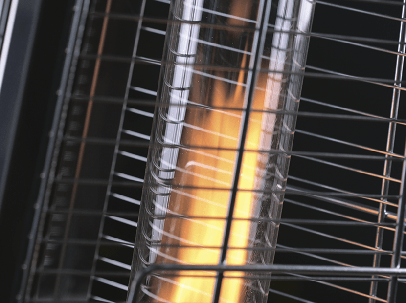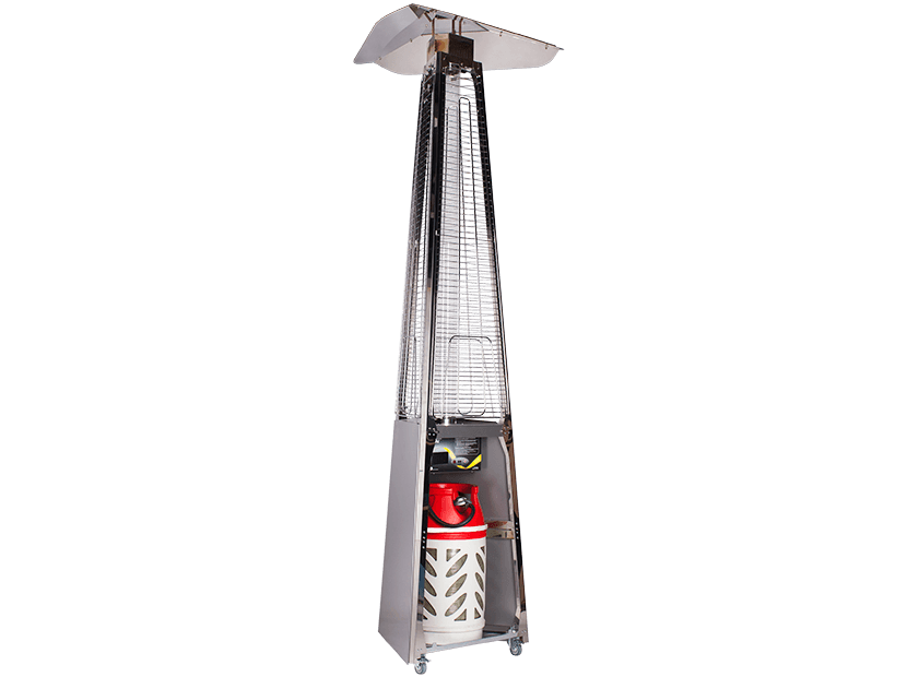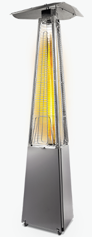 Уличный камин изготовлен из устойчивой к коррозии легированной нержавеющей стали и защищен от попадания атмосферных осадков сверху четырехгранным отражателем, площадь поверхности которого составляет 0,5 м². За безопасность эксплуатации отвечает многоуровневая система защиты. Датчик наклона отключает пламя при наклоне газового обогревателя более чем на 45°, термоэлектрический датчик и электромагнитный клапан сразу же останавливают подачу газа в критических ситуациях, таких как затухание пламени или утечка газа. За счёт встроенной колёсной базы обогреватель свободно и безопасно можно перемещать по любой поверхности.