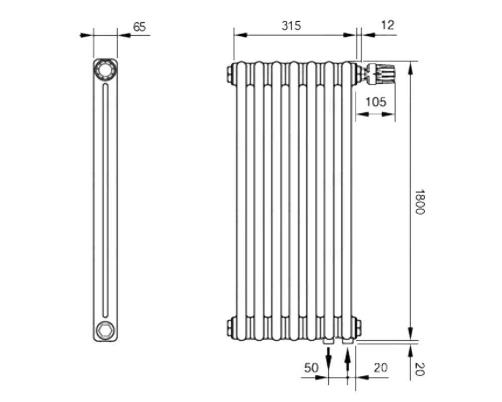 Радиатор Arbonia 2180V 7/31/89/12/1/1/12/3/0/0 AF 2-трубчатый, со встроенным вентилем справа вверху (M30x1,5), глубиной - 65 мм, высотой - 1800 мм. Количество секций - 7, общей длиной - 339 мм, подключение снизу справа с диаметром 1/2" внутренняя резьба, воздушный клапан сверху слева, рабочее давление: 10 бар. Общая мощность прибора при ΔT50 = 910 Вт. Цвет: белый.