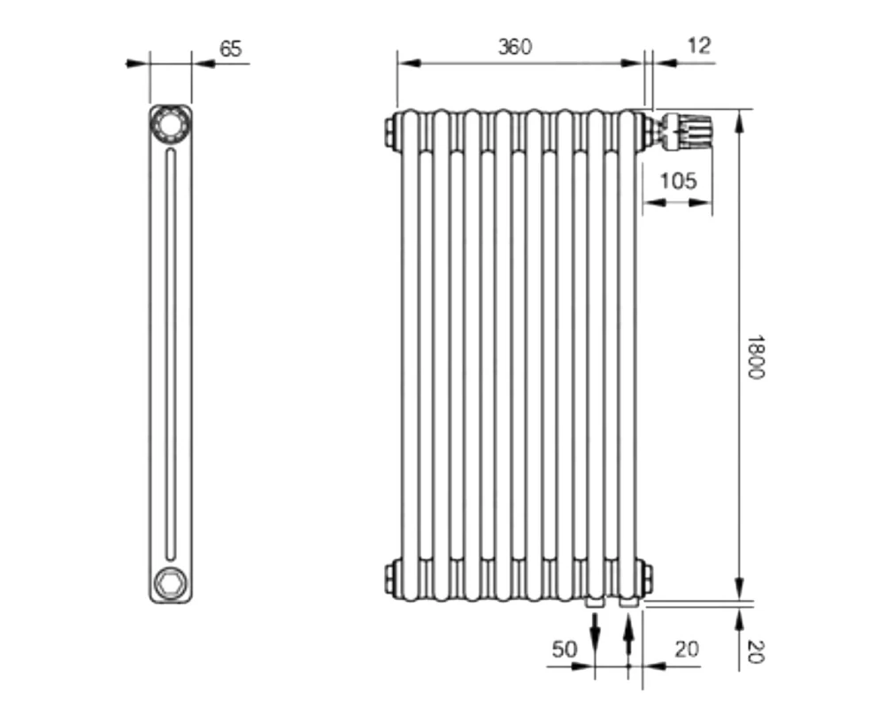 Радиатор Arbonia 2180V 8/31/89/12/1/1/12/3/0/0 AF 2-трубчатый, со встроенным вентилем справа вверху (M30x1,5), глубиной - 65 мм, высотой - 1800 мм. Количество секций - 8, общей длиной - 384 мм, подключение снизу справа с диаметром 1/2" внутренняя резьба, воздушный клапан сверху слева, рабочее давление: 10 бар. Общая мощность прибора при ΔT50 = 1040 Вт. Цвет: белый.