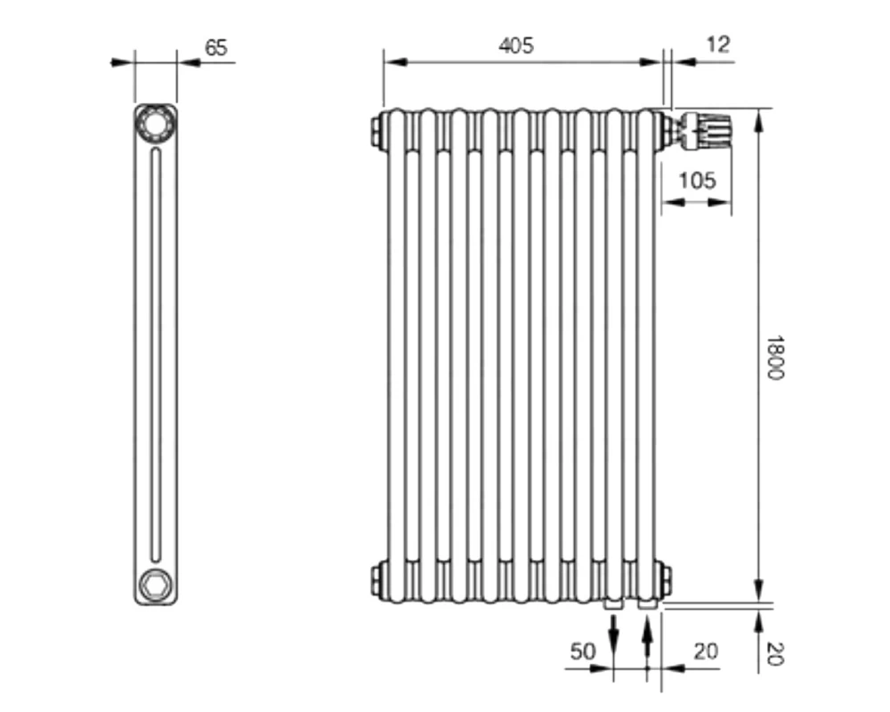 Радиатор Arbonia 2180V 9/31/89/12/1/1/12/3/0/0 AF 2-трубчатый, со встроенным вентилем справа вверху (M30x1,5), глубиной - 65 мм, высотой - 1800 мм. Количество секций - 9, общей длиной - 429 мм, подключение снизу справа с диаметром 1/2" внутренняя резьба, воздушный клапан сверху слева, рабочее давление: 10 бар. Общая мощность прибора при ΔT50 = 1170 Вт. Цвет: белый.