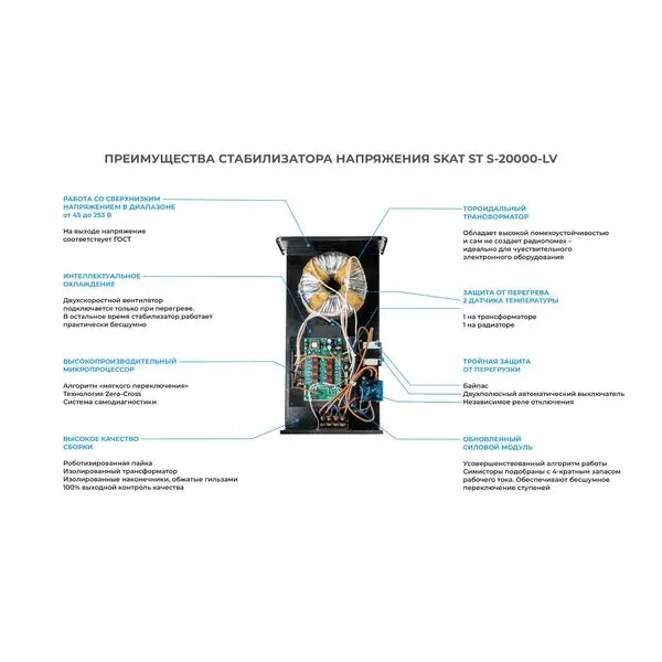 Стабилизатор SKAT ST S-20000-LV – надежное решение российских инженеров для защиты сети от перепадов, скачков напряжения и продления срока службы электроприборов. Главная особенность данного прибора – работа в условиях аварийно-низкого напряжения (от 45 В).