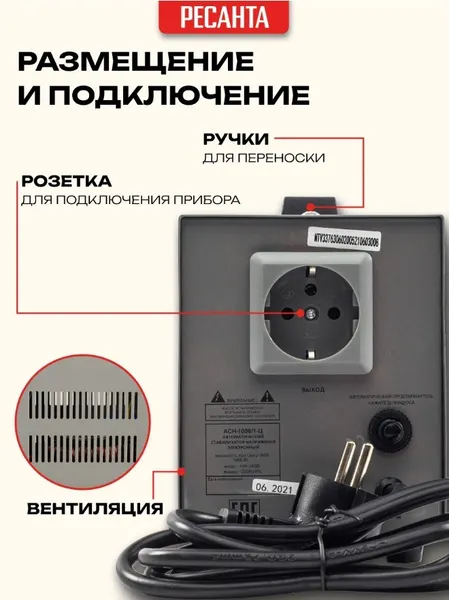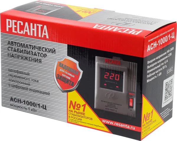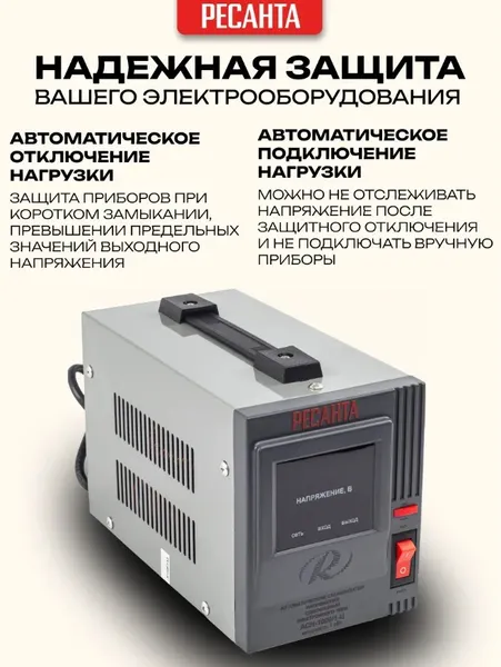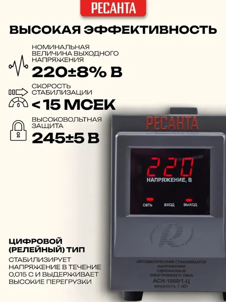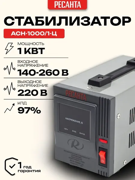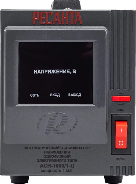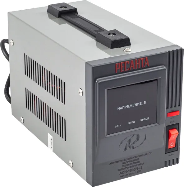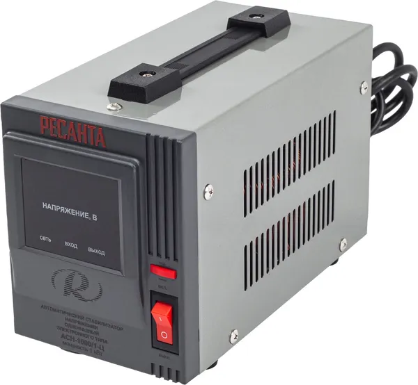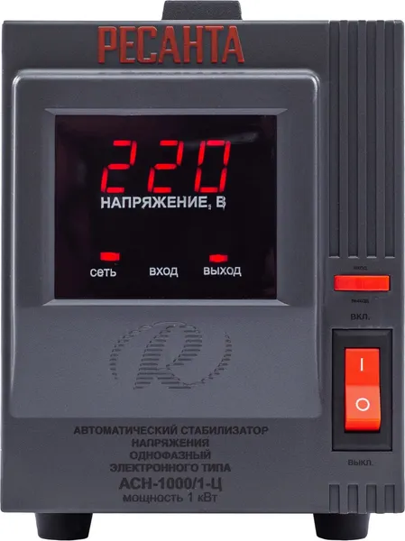 Стабилизатор напряжения Ресанта АСН 1000/1-Ц релейного типа предназначен для выравнивания входного напряжения и защиты приборов от перепадов напряжения с суммарной мощностью до 1 кВт. Работает с напряжением 220В с точностью до +/-8%. Устройство оснащено фильтрами сетевых помех, предотвращающими искажение частотной синусоиды, микропроцессорным управлением и цифровым индикатором напряжения, на котором отображаются параметры напряжения. Превышение пределов поддерживаемого входного напряжения автоматически отключает подачу питания. Прочный корпус защищает внутренние узлы аппарата от повреждений. Данный стабилизатор может обеспечивать стабильным питанием - телевизор, ресивер, DVD проигрыватель, кассовый аппарат, газовый котел.