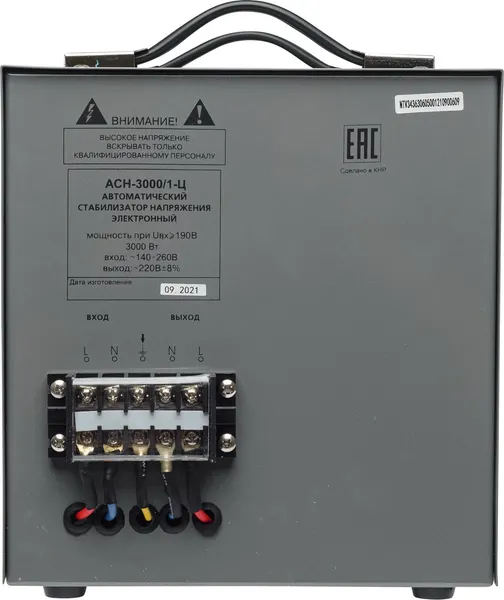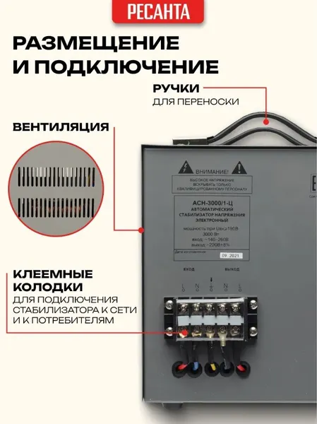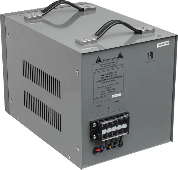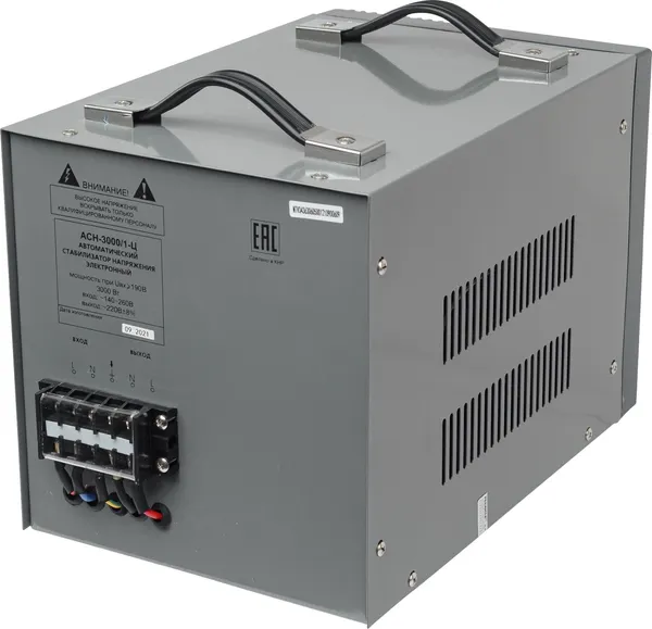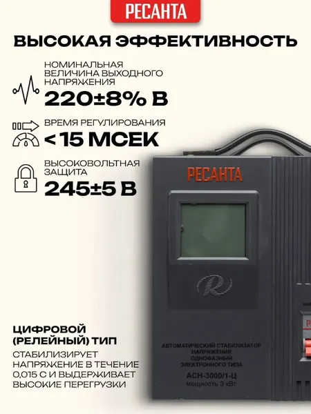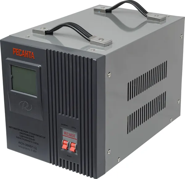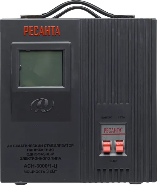 Стабилизатор напряжения Ресанта АСН 3000/1-Ц релейного типа предназначен для выравнивания входного напряжения и защиты приборов от перепадов напряжения с суммарной мощностью до 3 кВт. Работает с напряжением 220В с точностью до +/-8%. Устройство оснащено фильтрами сетевых помех, предотвращающими искажение частотной синусоиды, микропроцессорным управлением и цифровым индикатором напряжения, на котором отображаются параметры напряжения. Превышение пределов поддерживаемого входного напряжения автоматически отключает подачу питания. Прочный корпус защищает внутренние узлы аппарата от повреждений. Данный стабилизатор может обеспечивать стабильным питанием - телевизор, ресивер, DVD проигрыватель, кассовый аппарат, газовый котел.