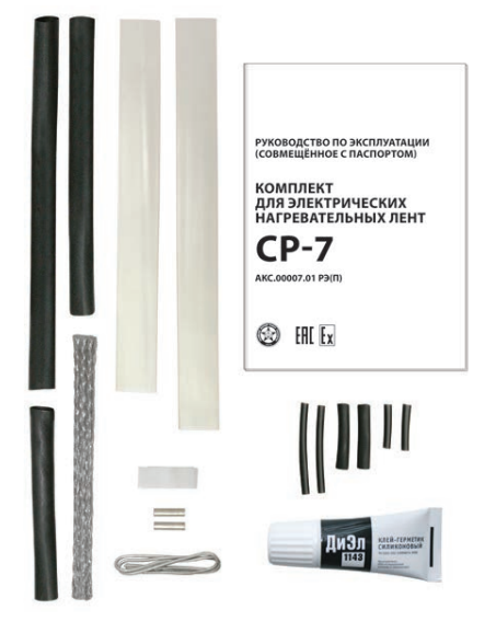 Комплект СР-7 включает в себя термоусаживаемые трубки на основе фторполимера, припой, медную луженую плетенку, фторопластовую ленту и клей-герметик.
