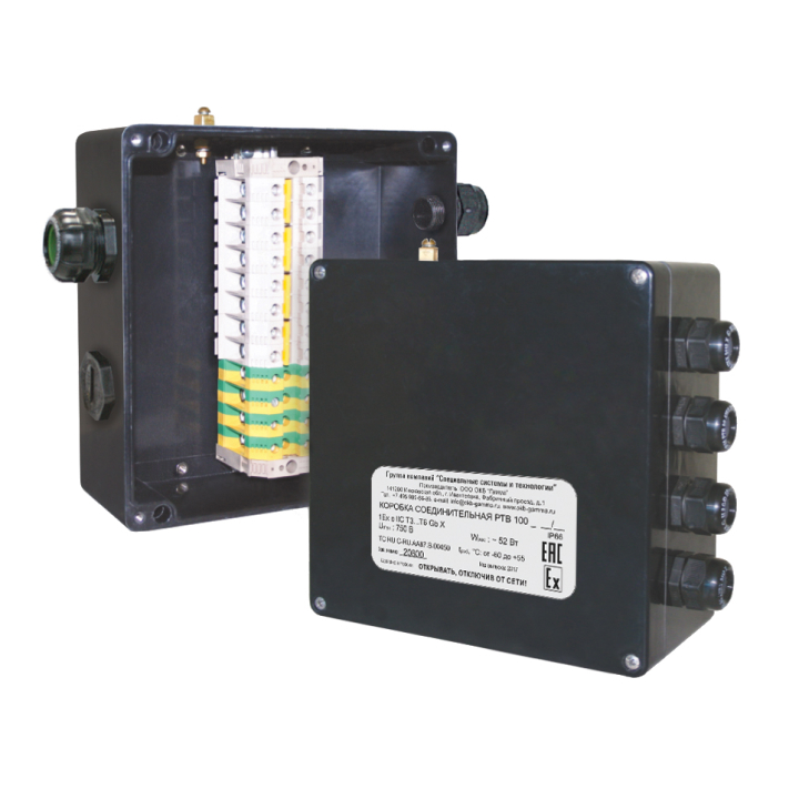 Соединительная коробка РТВ 1005 предназначена для распределения электроэнергии при монтаже силовых кабелей, создании инженерных сетей, их модернизации и ремонта во взрывоопасных зонах. Коробка крепится на близлежащей металлоконструкции. Коробка позволяет выполнить подключение до шести силовых кабелей.