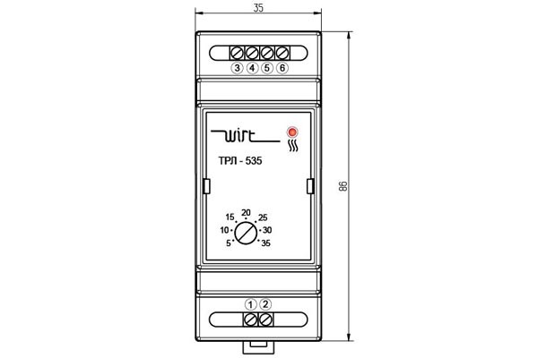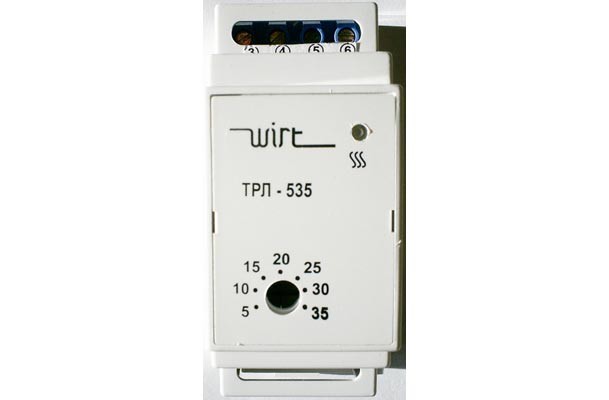 ТРЛ-535 — электронный терморегулятор предназначен для автоматического поддержания заданной температуры во внутренних помещениях, оборудованных электрическими кабельными системами обогрева путем включения/выключения нагрузки при помощи датчика отрицательного температурного коэффициента (NTC). Устанавливается на стандартную DIN-рейку для монтажа в шкафах управления системами обогрева зданий или групп помещений. ТРЛ-535 комплектуется датчиком температуры — терморезистором, помещенным в герметичный корпус и имеющим соединительный кабель длиной 2 м, устанавливается в полу между витками нагревательного кабеля. Регулятор снабжен ручкой плавной регулировки температуры (под шлиц отвертки) и шкалой условных значений задаваемой температуры. Имеется светодиодная индикация наличия питания и подачи напряжения на нагревательные секции.
