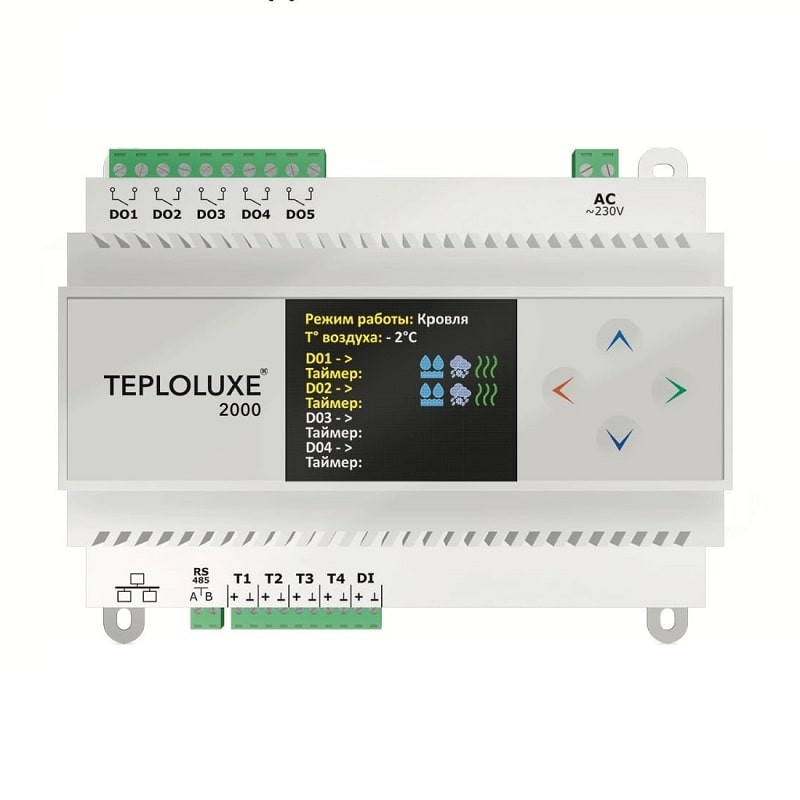 Контроллер Teploluxe 2000 используется для управления системами антиобледенения кровли и открытых площадок, обогрева трубопроводов и резервуаров, а также системами обогрева помещений (электрическими нагревательными кабелями, плёночными и другими электронагревателями).