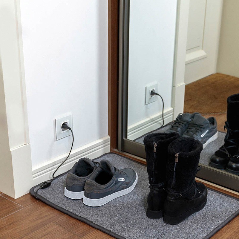 Коврик подогревается изнутри тонким нагревательным проводом. Поверхность греющего коврика выполнена из ковролина. Температурный режим обогрева подобран таким образом, чтобы создать комфортное ощущение тепла, а также обеспечить бережную сушку обуви.