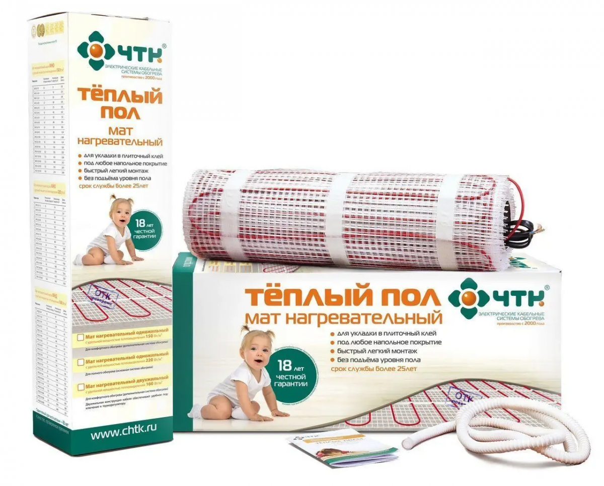 Нагревательный мат для теплого пола ЧТК МНД-160 1920 Вт/12 м2, двужильный. Кабельная система обогрева устанавливаются в плиточный клей или цементно-песчаную смесь.