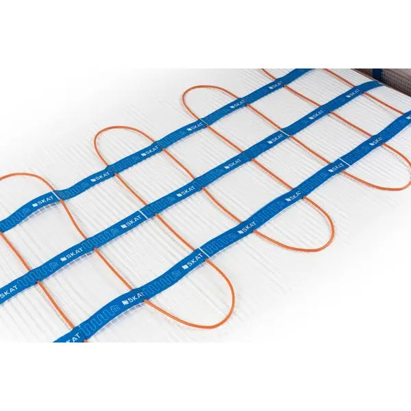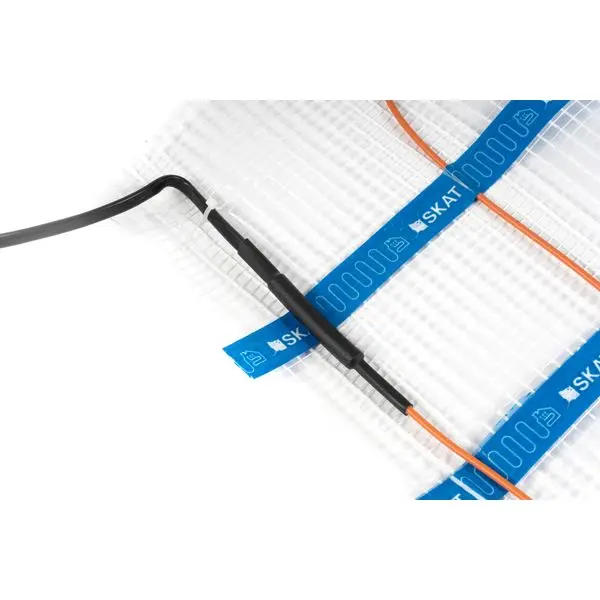 Электрический теплый пол SKAT HT MAT состоит из отрезка тонкого двухжильного нагревательного кабеля, уложенного змейкой и закреплённого на стеклосетке. Нагревательный кабель с одной стороны замуфтирован, с другой соединён с силовым шнуром посредством опрессовки. Место соединения силового шнура и нагревательного кабеля герметично закрывается соединительной муфтой. Температура на оболочке нагревательного мата +47°С (при температуре окружающего воздуха +20°С).