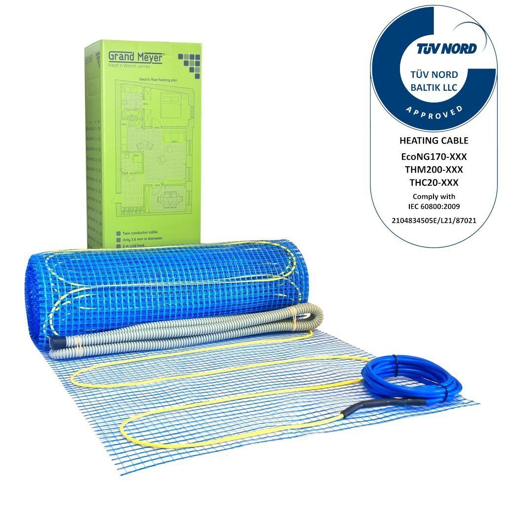 Нагревательный мат Heat'n'Warm EcoNG170 представляет собой тонкий двужильный нагревательный элемент, который волнообразно закреплен на стекловолоконной сетке шириной 50 см и длиной до 3000 см, в зависимости от типа и предназначен для укладки в слой кафельного клея. Кабель изготовлен с применением высококачественной термостойкой изоляции и защищен экраном. Для подключения мата к сети служит холодный провод длиной 3 метра.