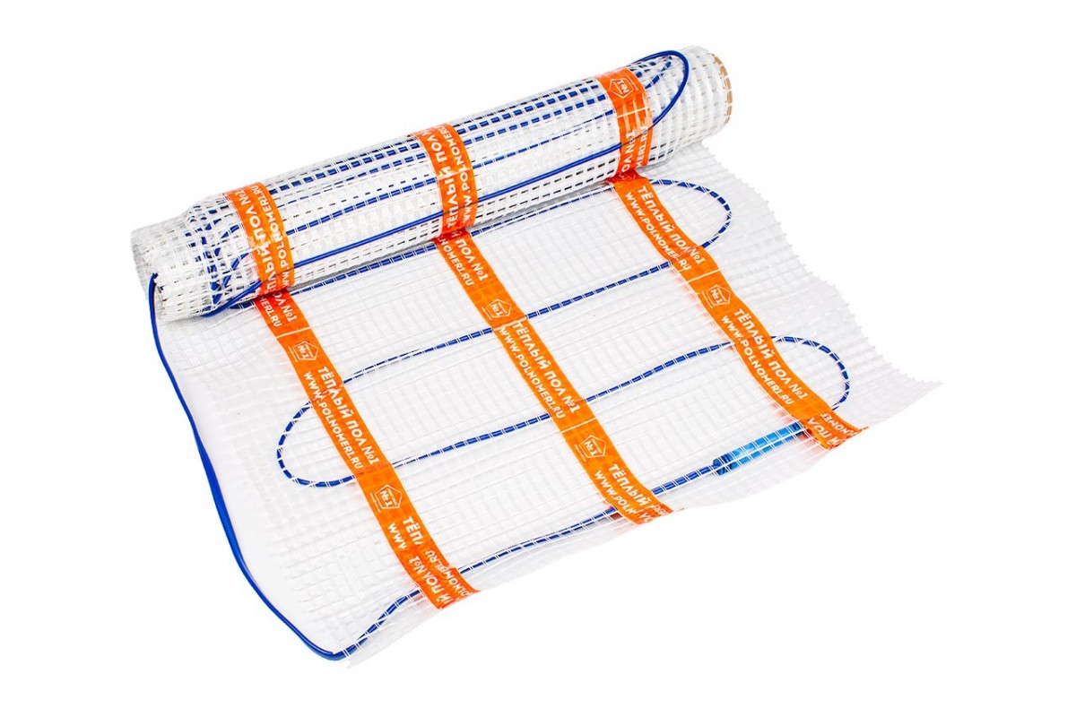 Теплый пол № 1 на основе нагревательного мата – Площадь обогрева: 15 м2; Мощность: 2400 Вт; Тип: двужильный, экранированный; Ширина мата: 0,5 м; Длина мата: 30 м; Напряжение: 220 В; Длина соединительного кабеля: 2,5 м; Материал сетки: стекловолокно