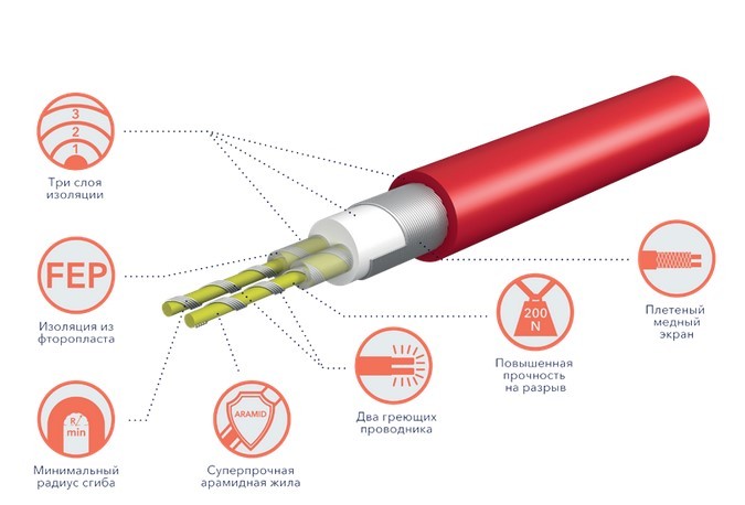 Конструкция позволяет перегибать кабель без риска обрыва или слома жил. Это достигается за счёт уникальной конструкции тонких витых греющих жил, длина которых превосходит длину кабеля на 6%. При любых деформациях или растяжениях основная нагрузка приходится на арамидную жилу, а греющие проводники легко адаптируются к изменению радиуса сгиба.