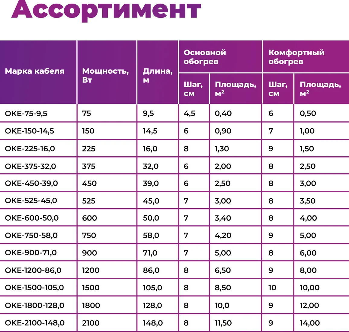 Мощность нагревательного кабеля можно выбрать в зависимости от ваших потребностей: для комфортного обогрева — 160 Вт/кв.м, а для основного обогрева — 180 Вт/кв.м. Увеличение мощности достигается за счет уменьшения шага раскладки кабеля, что позволяет эффективно использовать его в различных условиях.