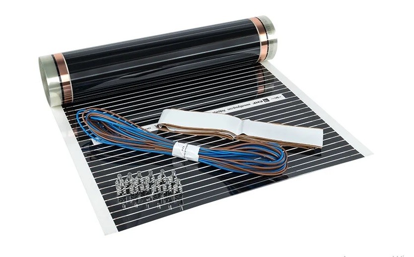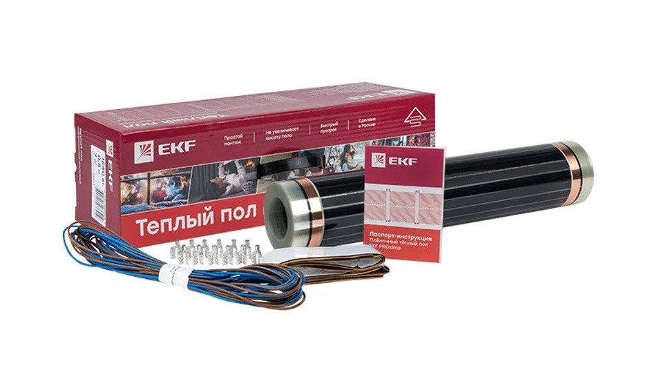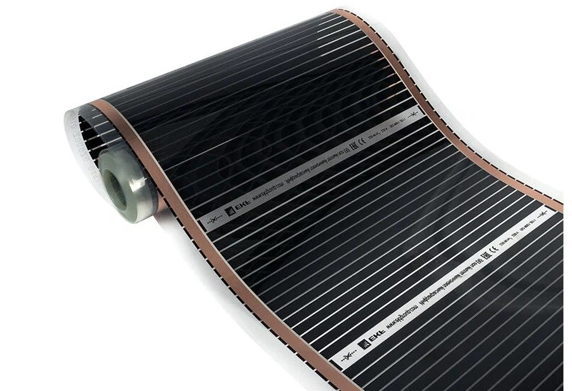 Пленочный теплый пол EKF применяется для сухого монтажа без стяжки не только при капитальном ремонте, но и при косметическом. Толщина пленки -0,338 мм. Обеспечивает быстрый и легкий монтаж. Идеально подходит для укладки под ламинат, паркетную доску, мягкое напольное покрытие: линолеум, ковролин. Инфракрасный пленочный теплый пол состоит из следующих элементов. Полосы углеродного материала шириной около 1,5 см соединены между собой при помощи медных шин с серебряным покрытием, которые и проводят электрический ток. Нагревательный элемент заламинирован с двух сторон плотным полимером, который не задерживает инфракрасное излучение и обеспечивает отличную защиту от попадания влаги, пробоев и возгорания.