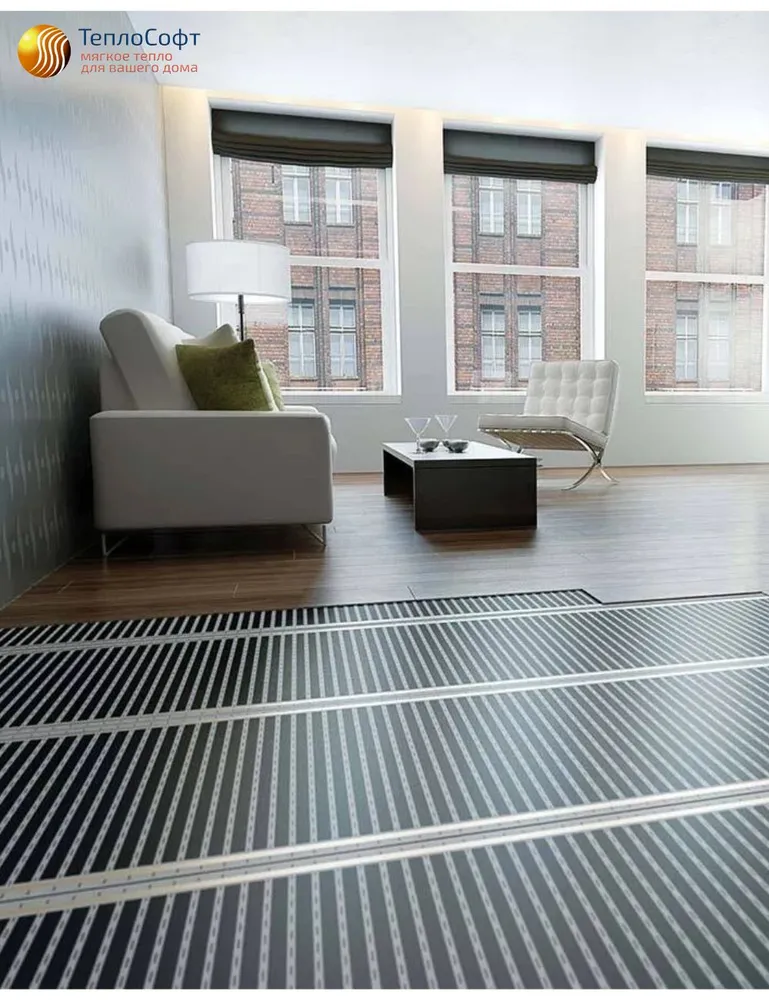 Максимальная длина одного отрезка - не более 1,9 кВт на 1 отрез термопленки или 8 м.п.. Монтаж теплого пола должен производиться на свободную от мебели площадь. Для дополнительной экономии электроэнергии и уменьшения теплопотерь при эксплуатации, рекомендуется между черновым полом и термопленкой уложить теплоотражающую подложку.