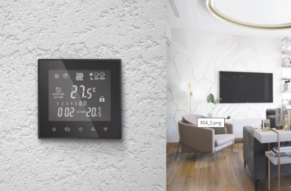 Терморегулятор Caleo SM934 черный, программируемый, сенсорное управление, экран, датчик температуры воздуха, монтаж скрытый (внутренний)