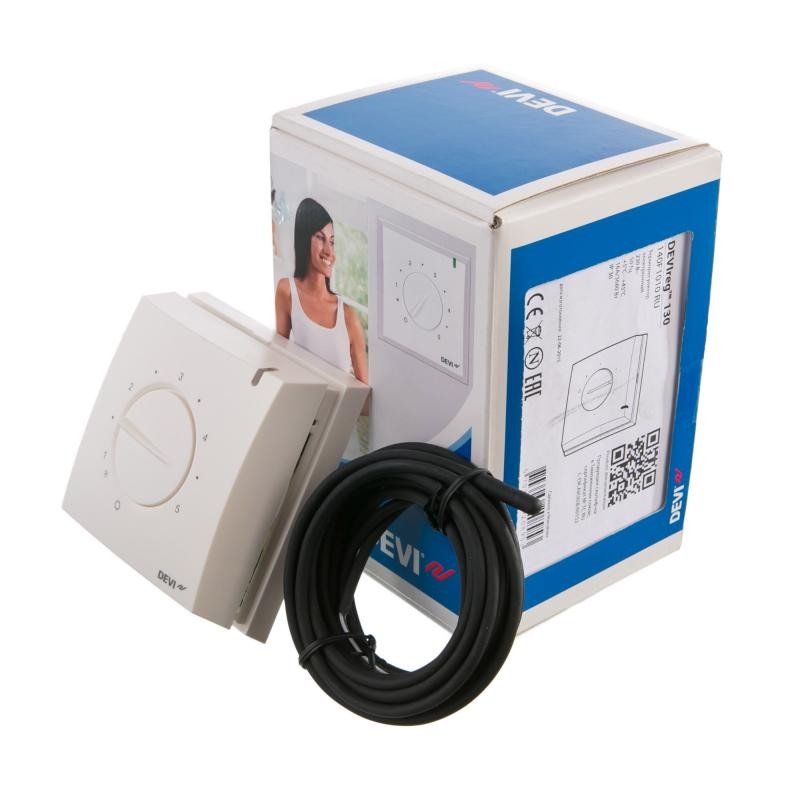 Терморегулятор электронный Devireg™ 130 для систем комфортного подогрева поверхности пола или полного отопления помещения, с возможностью монтажа на поверхность стены без монтажной коробки.