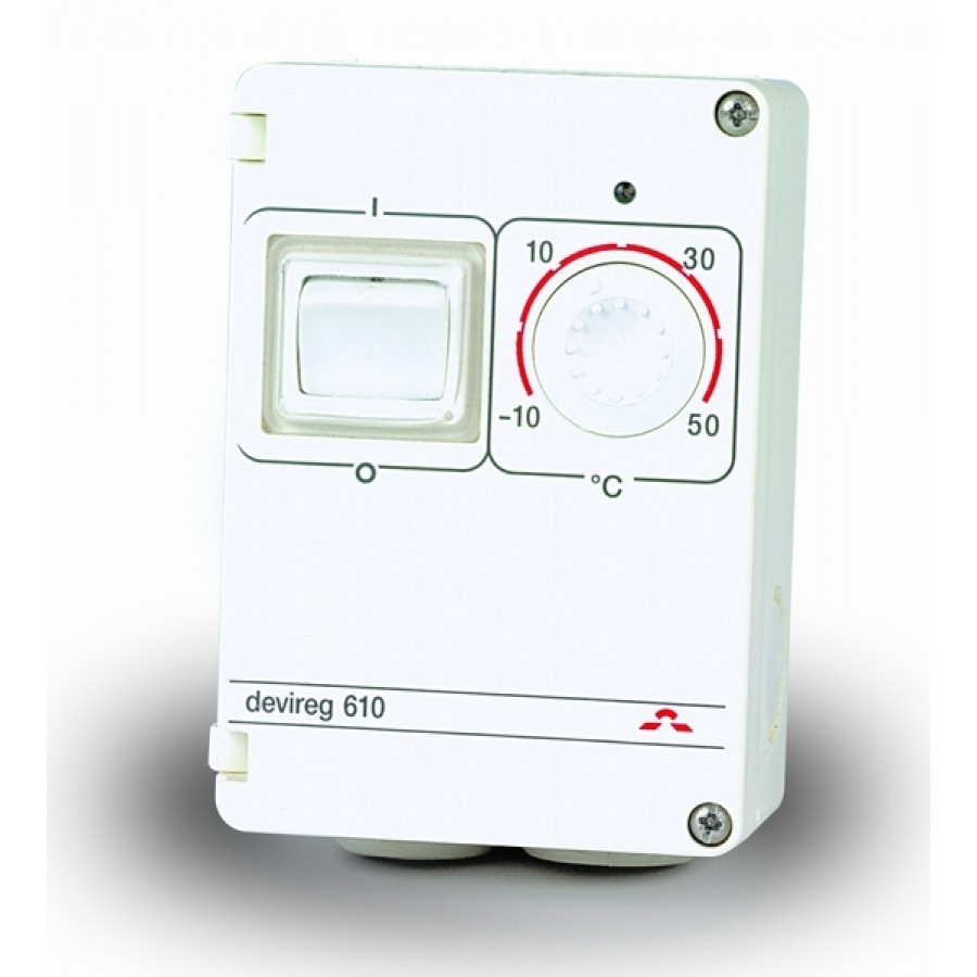 Термостат DEVIreg™ 610 (артикул 140F1080) представляет собой электронный терморегулятор, предназначенный для установки внутри помещения, на наружную стену здания или хомутом на трубу. Его сфера применения включает в себя управление системами кондиционирования, подогрева труб, емкостей, защиты от обледенения, обогрева помещений и комфортного подогрева полов. Устройство оборудовано 2-х полюсным выключателем и проводным датчиком для регулировки температуры. Также терморегулятор снабжен ручкой для регулировки температуры, со шкалой от -10 до +50°C и светодиодным индикатором, отображающим режим работы красный цветом, а режим ожидания зеленым цветом. Такая модель терморегулятора имеет герметичный корпус с защитой от влаги и пыли соответствующей стандарту IP44.