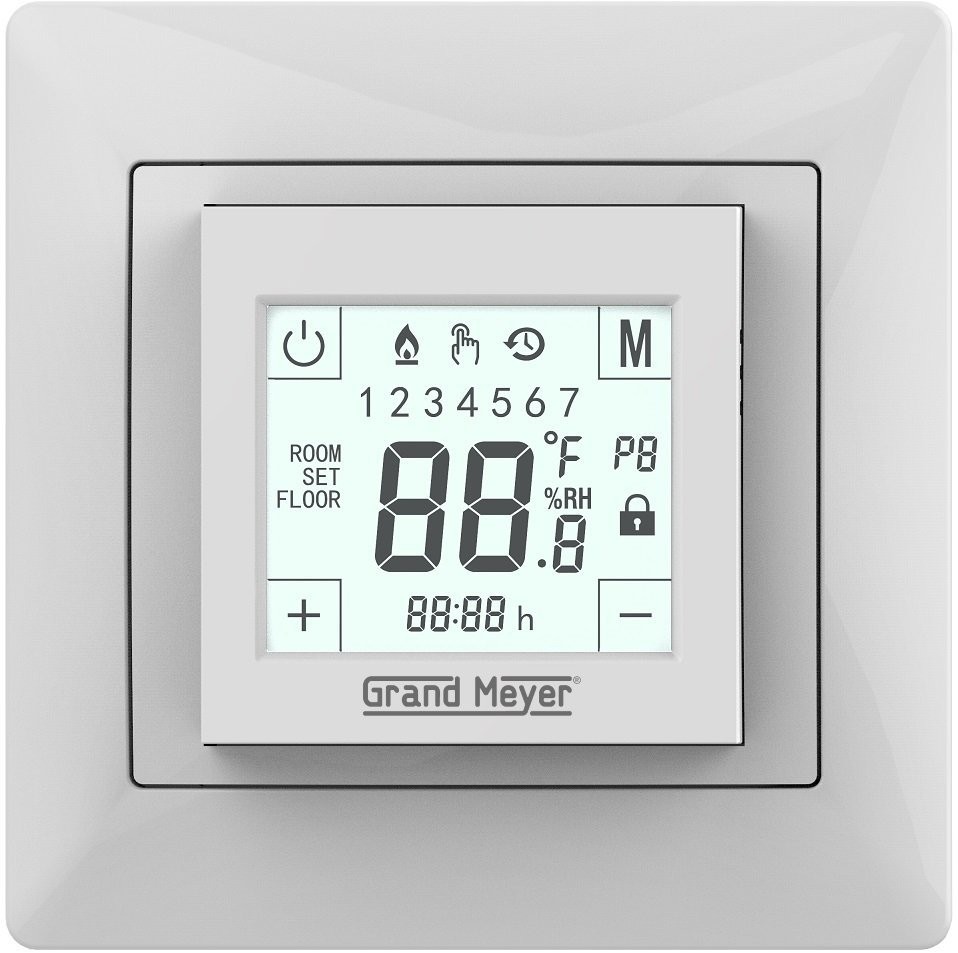 Grand Meyer Mondial Series W225, программируемый терморегулятор с сенсорным дисплеем для управления отоплением электрического типа. Возможность программируемого а так же ручного управления. Возможность установки недельного периода 5+2/6+1/7 дней. Максимальная нагрузка 3600 W. Установка в стандартную монтажную коробку. Память настроек при отключении питания. Огнезащитный пластик. NTC датчик. Диапазон установки: от +5 до +35 (заводские).