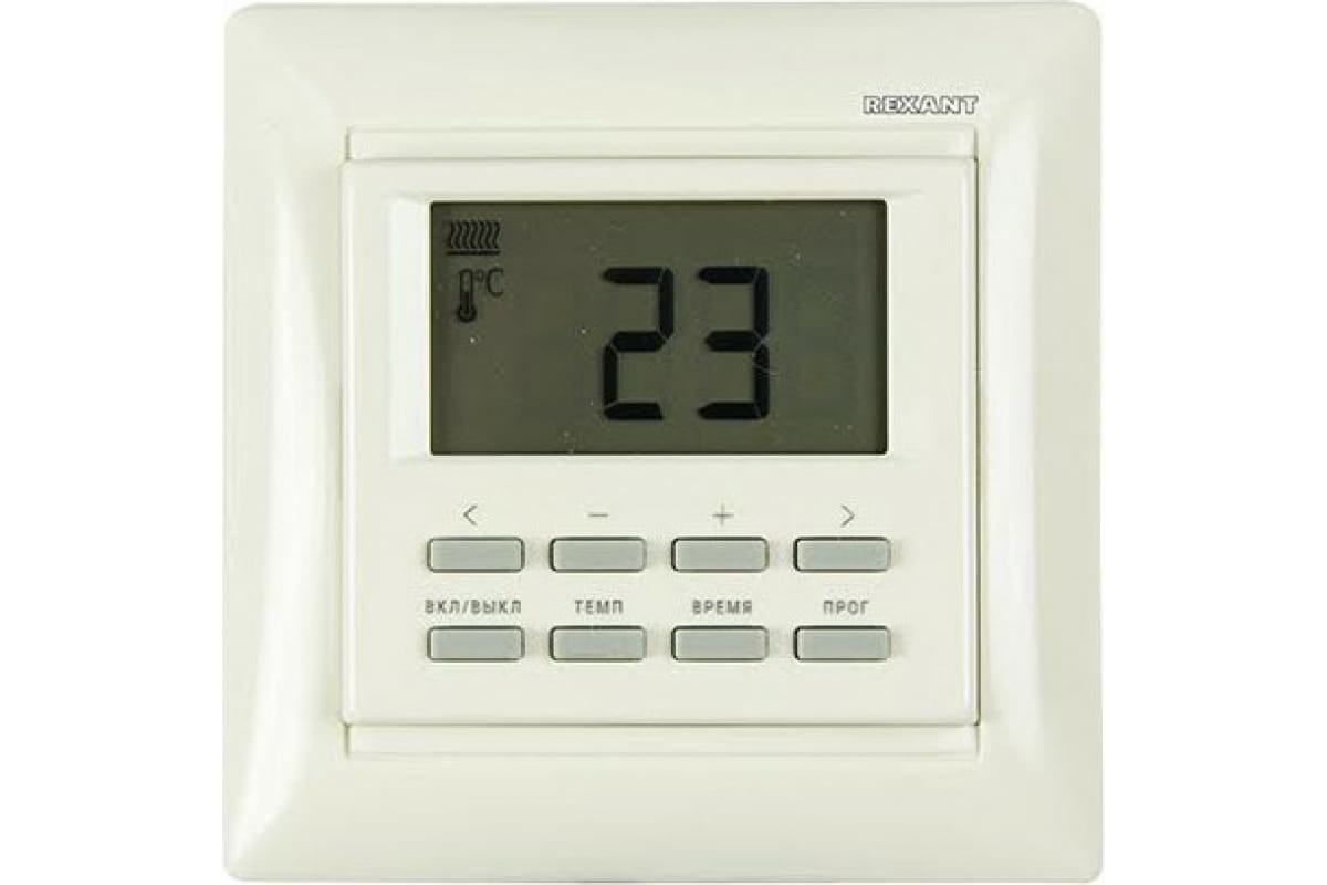 Терморегулятор программируемый REXANT RX-527H бежевый, совместим с Legrand серии Valena, программируемый, кнопочное управление, экран, монтаж: встроенная установка, корпус IP20