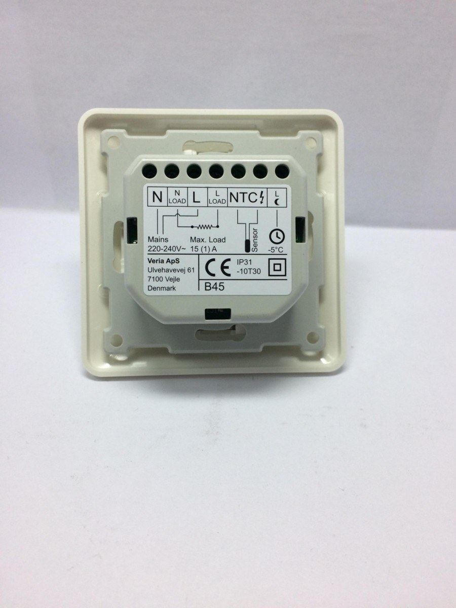 Электронный терморегулятор Veria Control В45 применяется для управления электрическими кабельными системами «Теплый пол». Терморегулятор может также быть использован для управления другими системами электроотопления или системами отопления с электрическими блоками контроля. Поставляются в виде готового электронного блока для установки в стенную монтажную коробку с крепежной базой 60 мм, аналогично электрическому коммутационному оборудованию для скрытой проводки. Имеет выносной датчик температуры на проводе, который устанавливается в зоне обогрева.