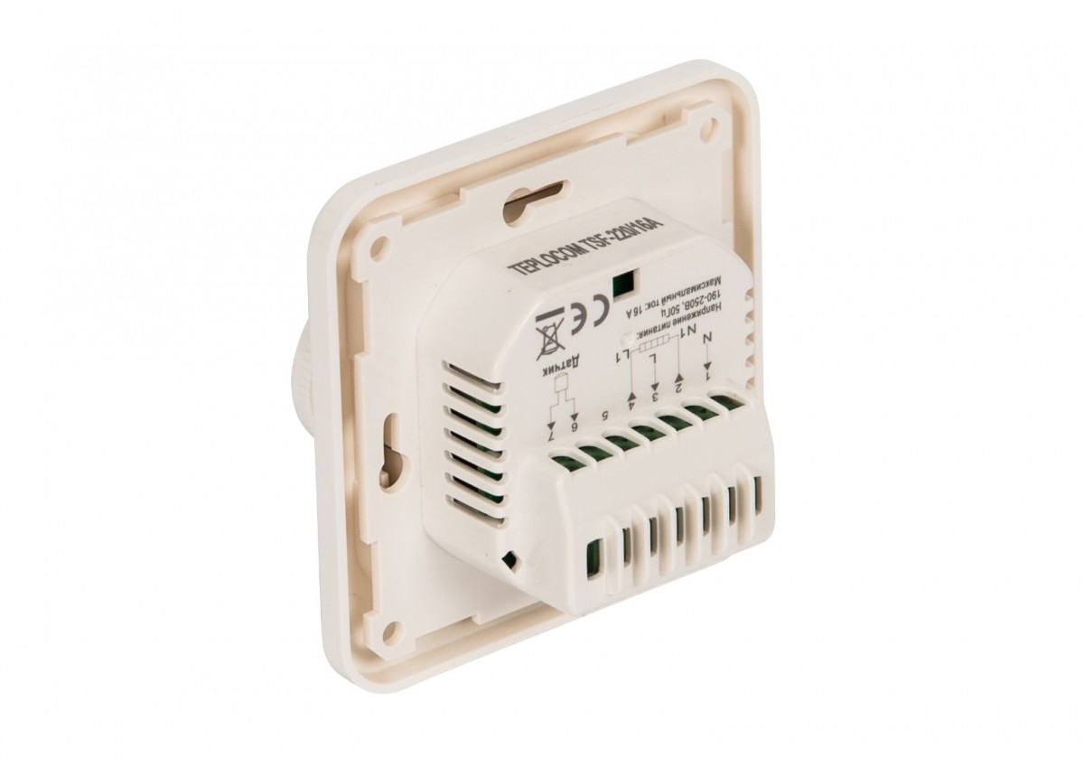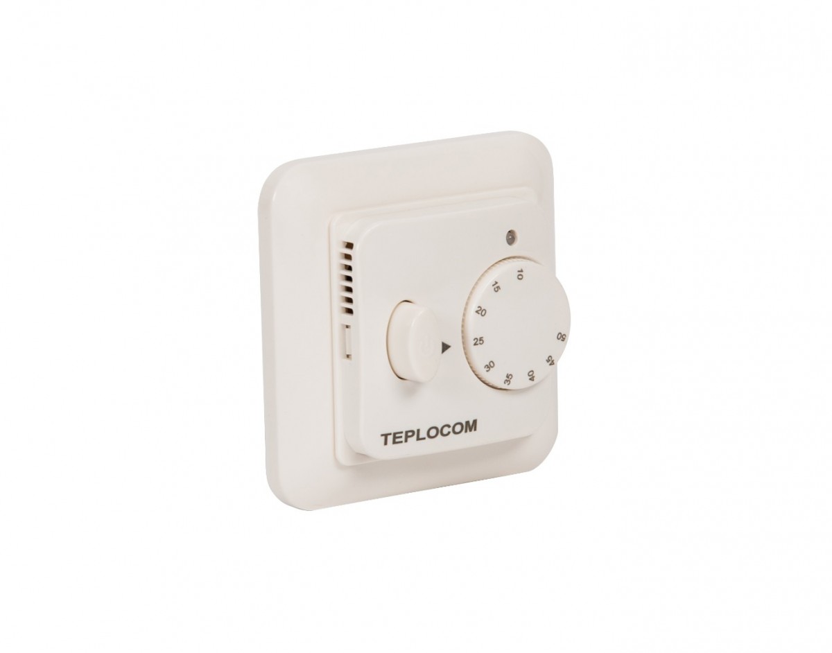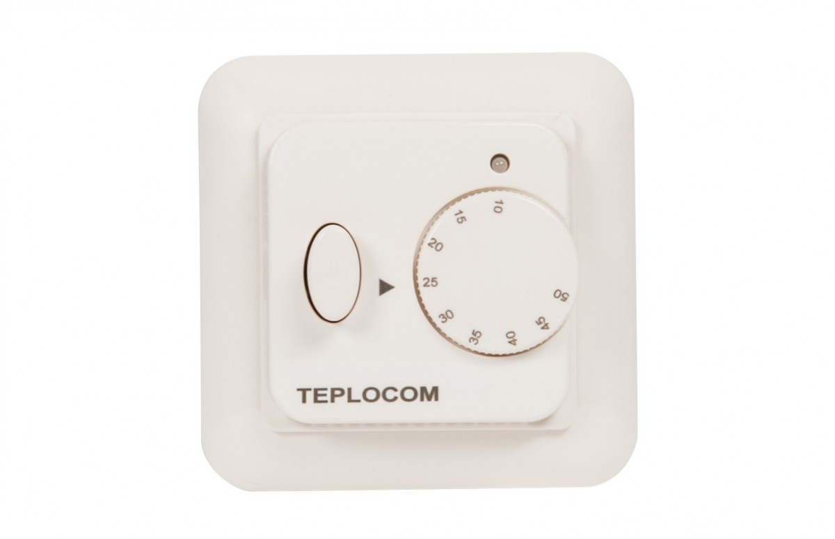 TEPLOCOM TSF-220/16A представляет собой прибор, устанавливаемый в обыкновённую внутреннюю электромонтажную коробку рядом с любой удобной розеткой. Высота установки — от 50 см. Если в доме есть дети - учитывайте это, однако имейте ввиду, что длина питающего провода от термоматов и провода термодатчика составляет 2 метра. На лицевой панели TEPLOCOM TSF-220/16A есть градуированный диск управления (ручка) и сигнальный светодиод красного цвета, включающийся при подаче напряжения на тёплые полы, и мигающий в случае аварии термодатчика. Существующая мощность подключаемой нагрузки составляет 16 А, что позволяет подключать любые комплекты тёплых полов из линейки TEPLOCOM МНД.