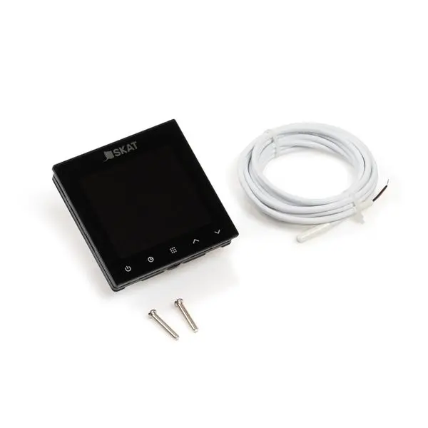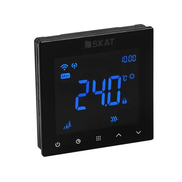 SKAT HT TS 16А Lux – программируемый термостат для регулирования температуры в помещениях с системами водяного и/или электрокабельного обогрева. Термостат располагается в помещении и соединяется проводами с исполнительным оборудованием (электромагнитные клапаны, сервоприводы, циркуляционные насосы, котлы и др.).