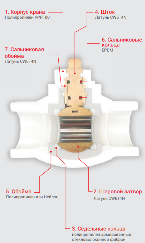 Кран имеет латунный хромированный шаровой затвор и латунную сальниковую гильзу. Монтаж осуществляется методом раструбной сварки. Может использоваться на трубопроводах холодной и горячей воды. Использование латунной сальниковой гильзы вместо пластиковой исключает протечки из-за деформаций сальникового узла во время формовки.