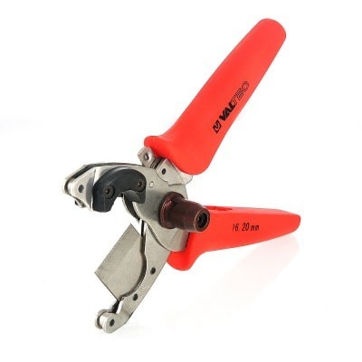 Разрезание металлополимерных (металлопластиковых) труб несложная, но ответственная операция. От ее правильного выполнения зависят оперативность монтажа, надежность соединений. Быстрое, качественное (без скоса, деформации стенок) разрезание обеспечивают специальные ножницы, резаки. Резак для металлопластиковых труб VT.393 – облегченный, рекомендуемый для монтажа трубопроводов диаметром 16, 20 мм. Особенность инструмента – наличие встроенных калибраторов (для восстановления формы трубы на срезе). Требуемый обхват трубы, перпендикулярное направление съемного ножа гарантируется конфигурацией скоб – опорной и верхней. Предусмотрены удобные рукоятки с пластиковым покрытием, защелка-фиксатор закрытого положения. Резаком можно разрезать полипропиленовые трубы диаметром 20 мм.