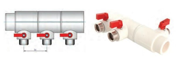 Тройник полипропиленовый коллекторный с шаровым краном можно применить для изготовления коллекторов: сваривая фитинги друг с другом, монтажник получит распределитель потоков с необходимым числом выходов (межцентровое расстояние – 54 мм). Использовать такое изделие бывает удобнее, чем готовый полипропиленовый коллектор с отводами под приварку PPR-труб. Благодаря латунным выходам стандарта «конус» (1/2”) или «евроконус» (3/4") присоединять трубы к такому коллектору можно с помощью обычных коллекторных фитингов. Корпус тройника выполнен из полипропилена PPR100, закладная резьбовая деталь – латунная (марка сплава – CW617N, способ изготовления – горячее штампование), никелированная. Шаровой затвор хромирован по медной подложке и уплотнен тефлоновыми кольцами. Уплотнение штока – два кольца из EPDM Sh70. Диаметр патрубков под муфтовую сварку (внутренний/наружный) – 40 мм.