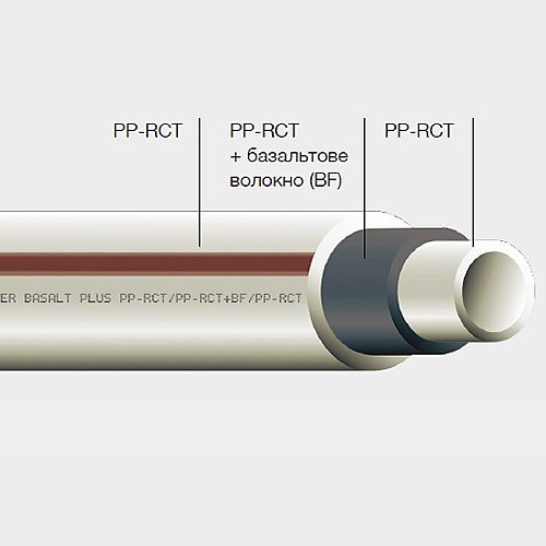 Состоит из 3 слоёв и представляет собой комбинацию полипропилена и специального стекловолокнистого состава, находящегося в среднем слое трубы. Наружный и внутренней рабочий слой трубы выполнены из полипропилена, средний (внутренний) слой состоит из стекловолокна и полипропилена. Комбинированные трубы изготавливают диаметром от 20 до 110 мм, при этом толщина стенки варьируется в диапазоне от 2,8 до 15,1 мм. Данные трубы рассчитаны на рабочее давление 2MПа. Основным преимуществом по сравнению с трубами из однородного полипропилена является более низкий (в 2,63 раза) коэффициент линейного температурного расширения.