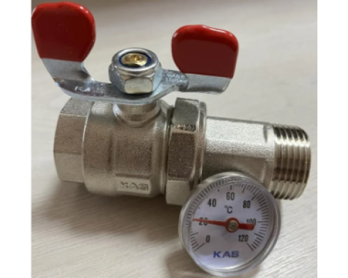 Кран для коллектора 1" красный KAS для теплого пола с термометром красная или синяя ручка KAS 1" с американкой.