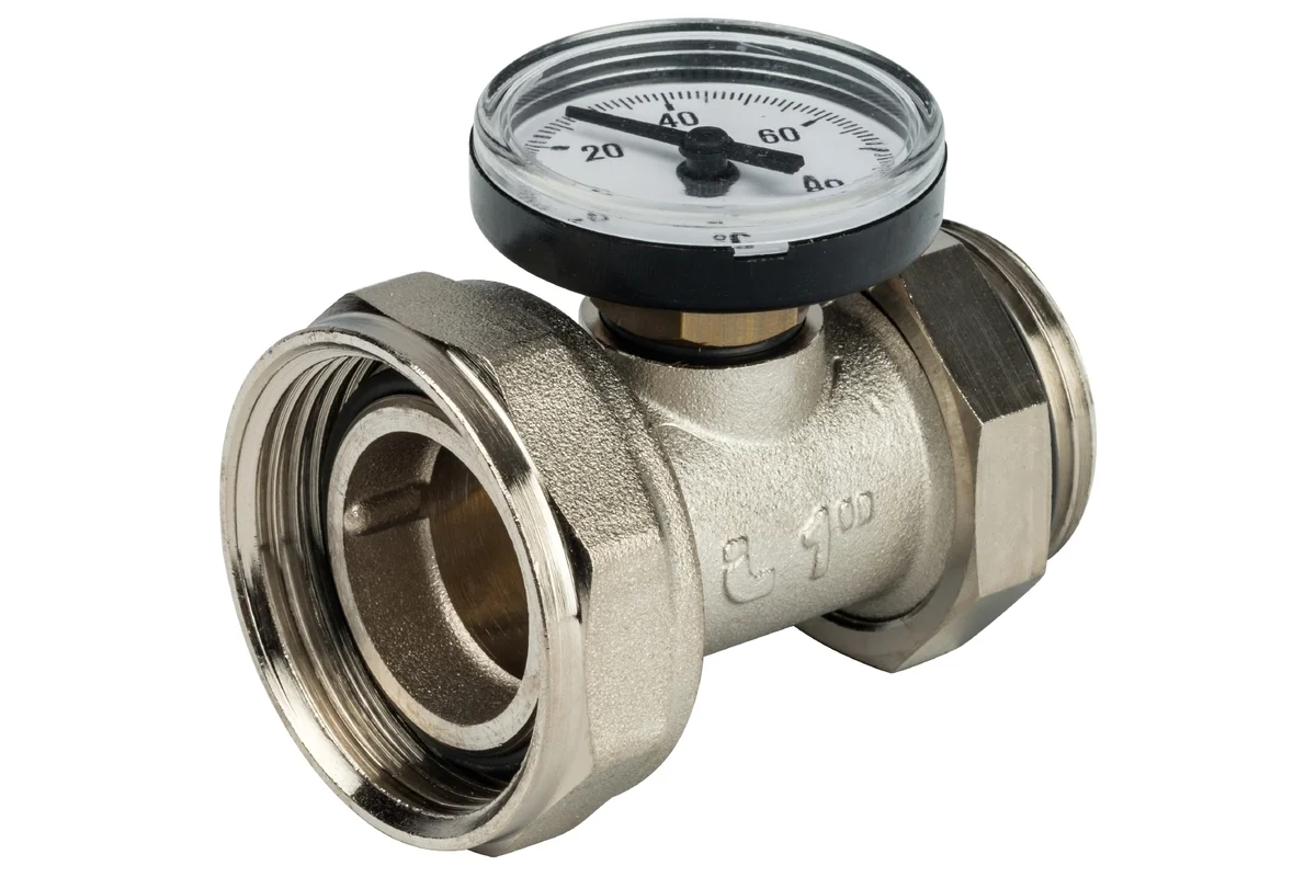 Комплект прямых шаровых кранов с термометрами STOUT 1" SMS-1000-030001 устанавливается на трубопроводах как промышленного, так и питьевого водоснабжения. Монтаж набора осуществляется на коллектор STOUT.